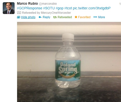 I wanted to write something quick and casual about last nights State Of The Union events. I thought the words to Marco Rubio’s speech were excellent. Whoever wrote that speech did one hell of a job but you could painfully feel his nervousness. I had so hoped that he was going to knock it out of the park for the GOP but from the very beginning you could hear his voice trembling. It definitely didn’t look presidential. Glenn Beck called it his Bobby Jindal moment. I think Bobby Jindal pretty much ruined his career with his response to the State of The Union that year. So, Beck was a little harsh on Rubio who still has amazing potential even if he is a little rough around the edges. Anybody who grew up dreaming of becoming the first Hispanic president and who spent their teenage years with a huge poster of Ronald Reagan over their bed is alright in my book. The scene with the water was awkward but he pulled a recovery with the below tweet which he posted immediately following the speech.