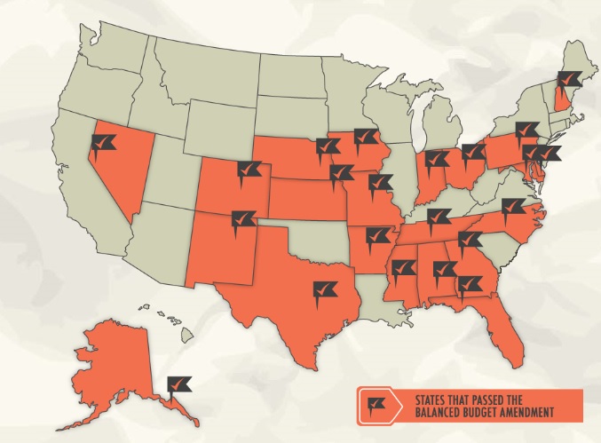 While I think we need many more amendments, especially one for term limits, here is the progress report on the balanced budget amendment. The map is from Demand Balance Now.
